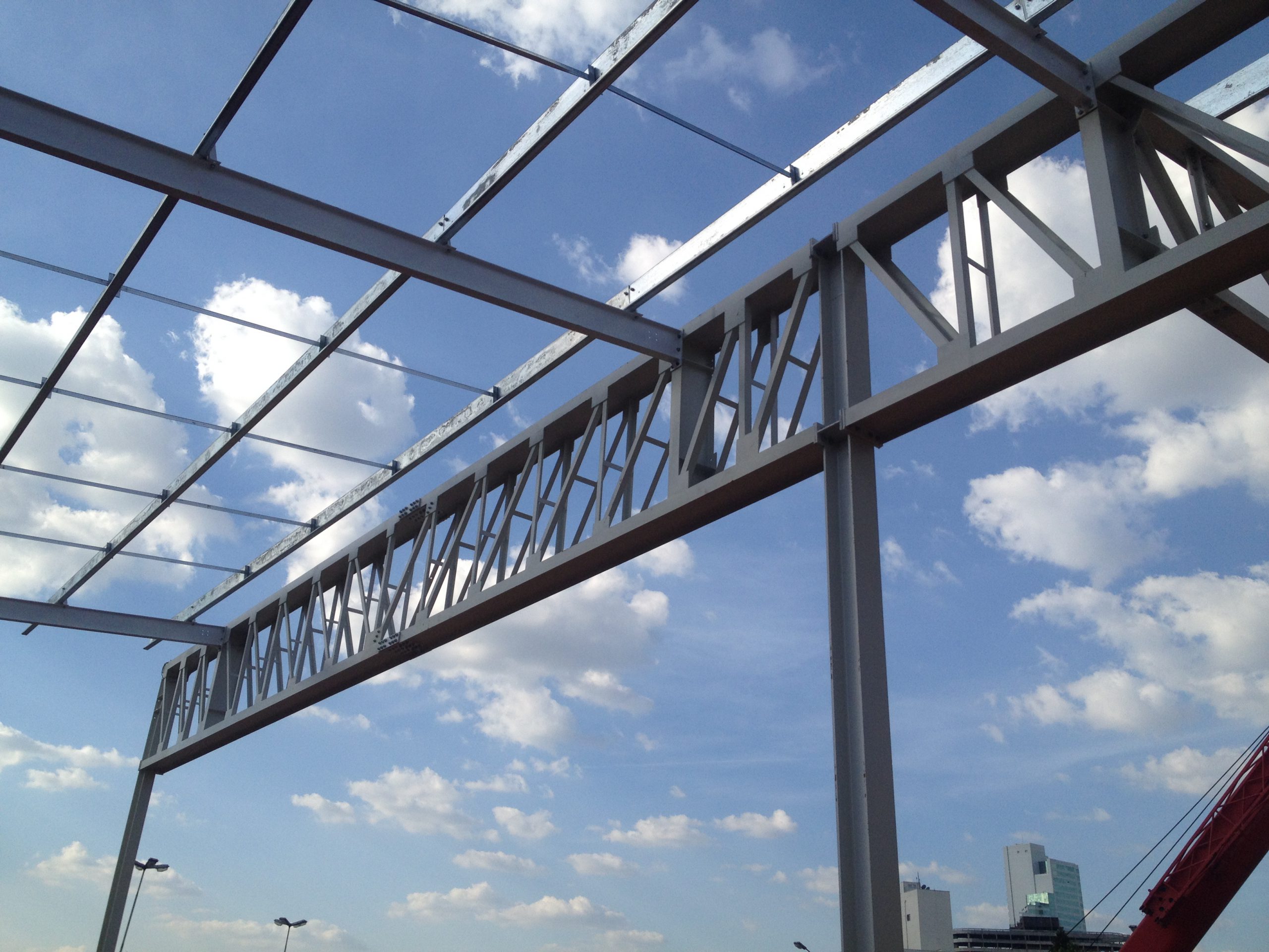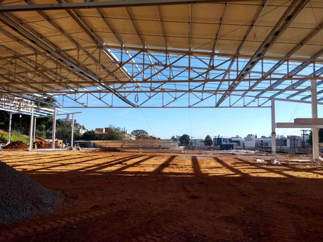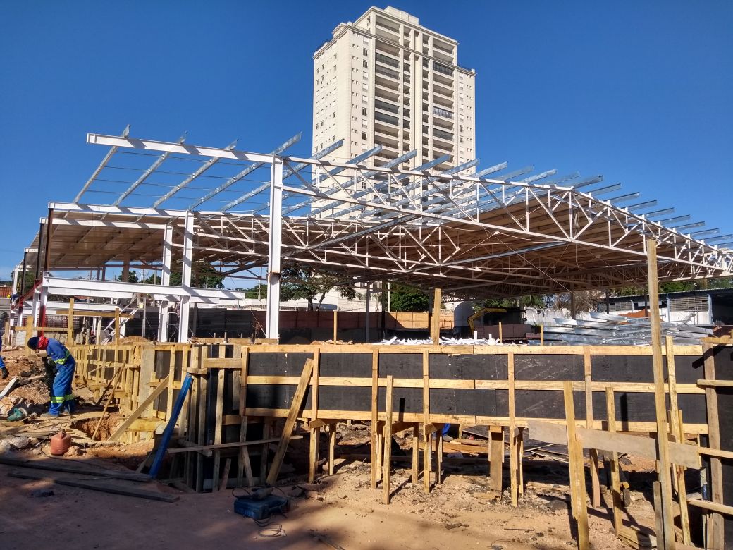 Obra de Supermercado em Jundiaí, cobertura em estrutura metálica com área aproximada de 4000m², tesouras treliçadas vencendo vão livre de 42m, apoiada sobre pilares metálicos, fechamentos lateriais em perfis metálicos para receber sitema ventilado ceramico, compreende ainda essa obra as escadas e marquises do predio