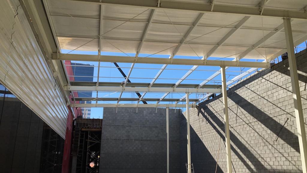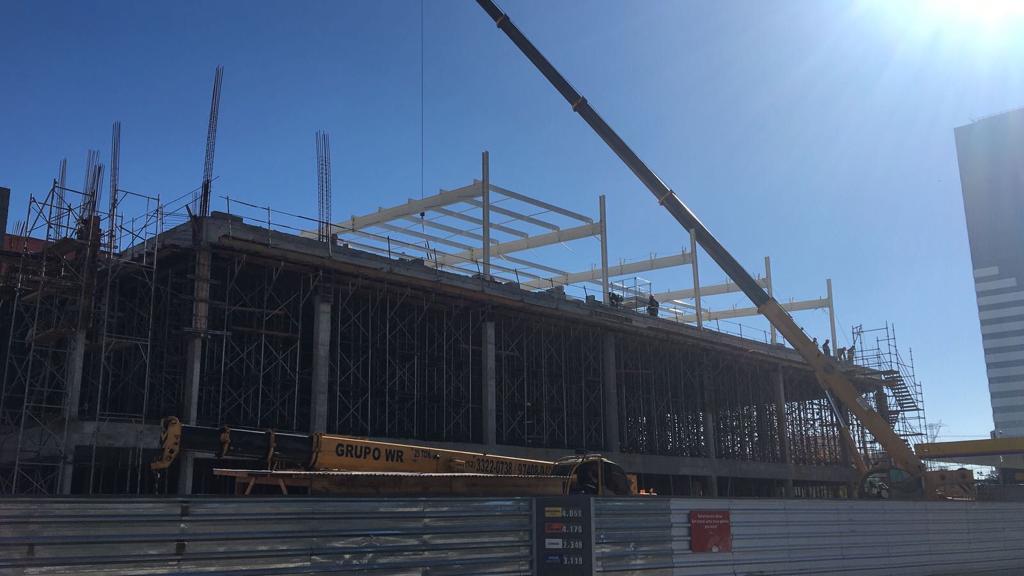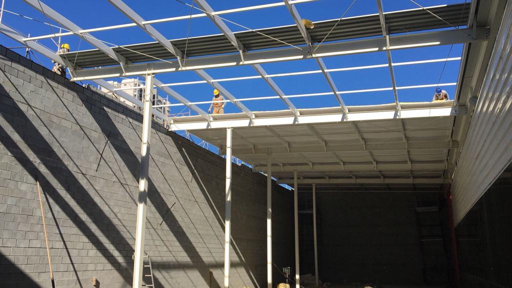 Estrutura de cobertura da amplição do mall no hipermercado Extra em São Jose dos Campos, com estruturas de alma cheia vencendo vãos de 20 metros, a estrutrua foi instalada sobre estrutura de concreto e recebeu na cobertura sistema de telhas sanduiches com lã de rocha