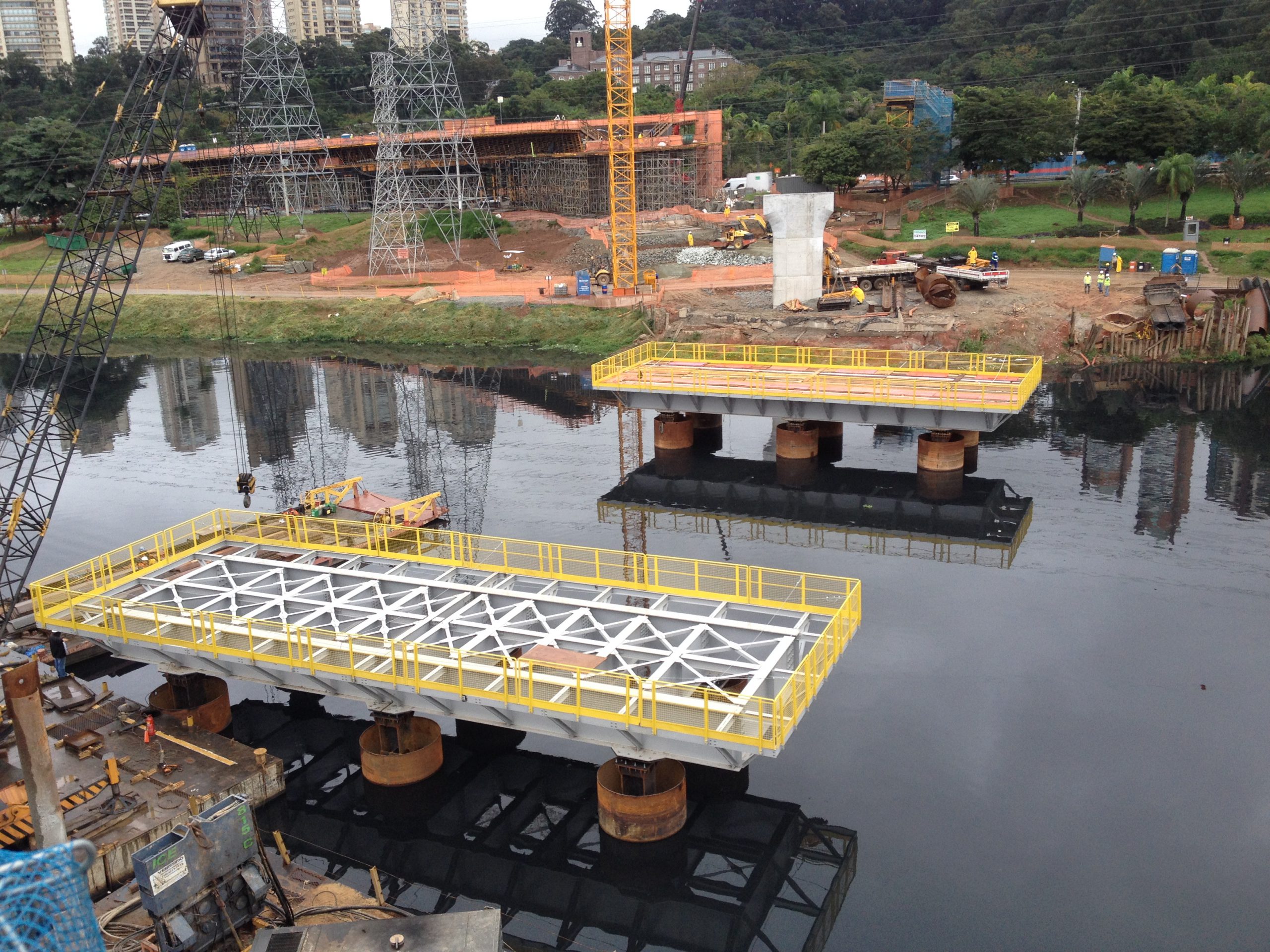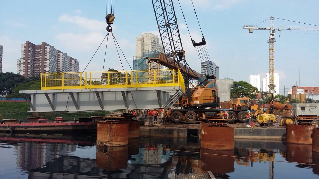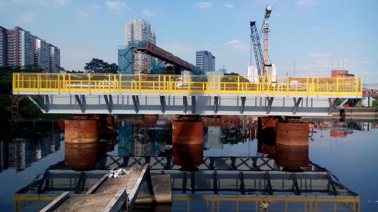 Os módulos que tem peso de 45t cada foram montados na margem do rio e transportados por balsa até o local de instalação. A estrutura que tem dimensões de 20,0 x 8,0m, é composta por vigas metálicas que chegam a altura de 1500mm e peso de 585 kg/m. Os módulos foram apoiados sobre estacas metálicas cravadas no leito do rio.