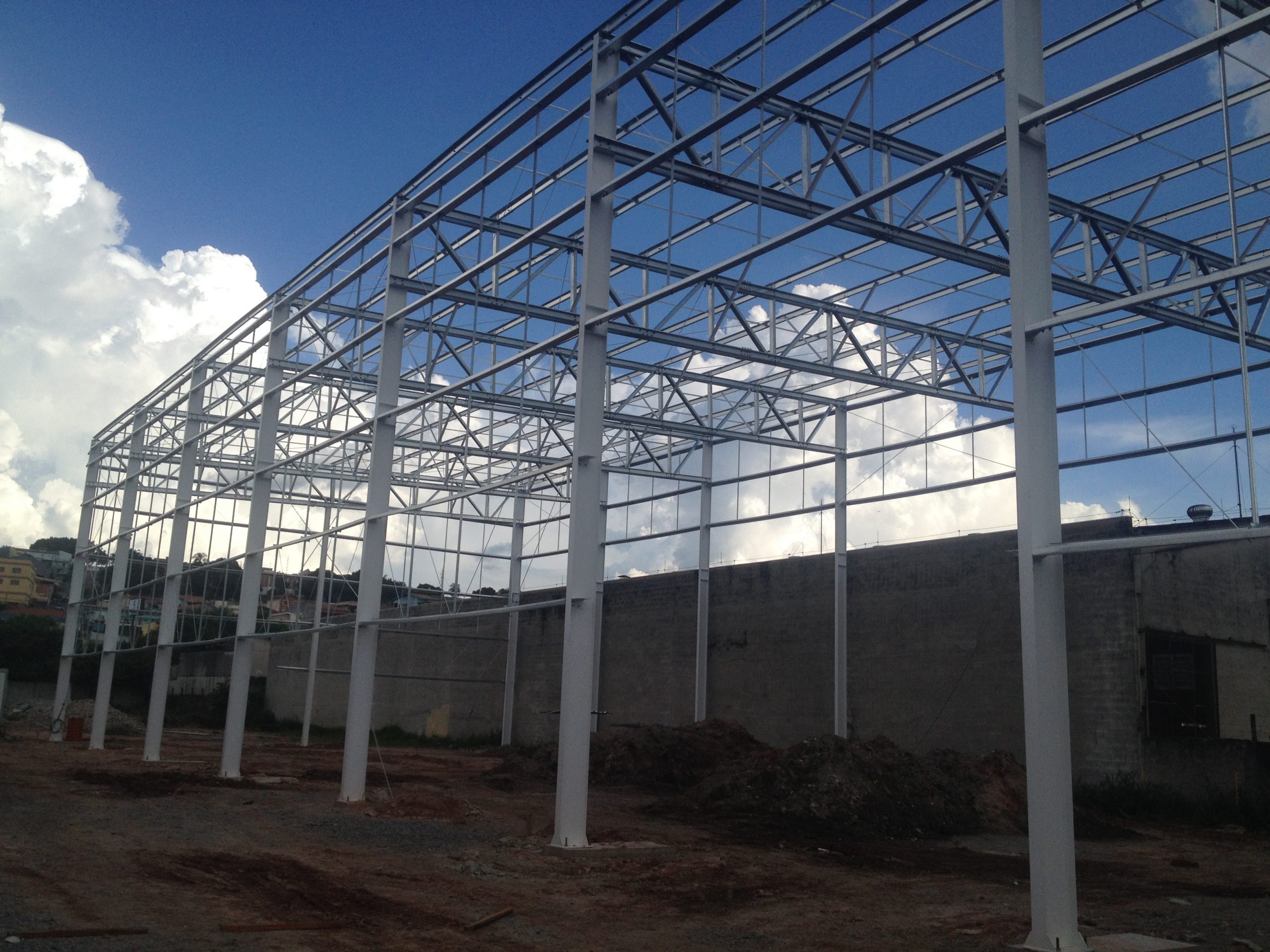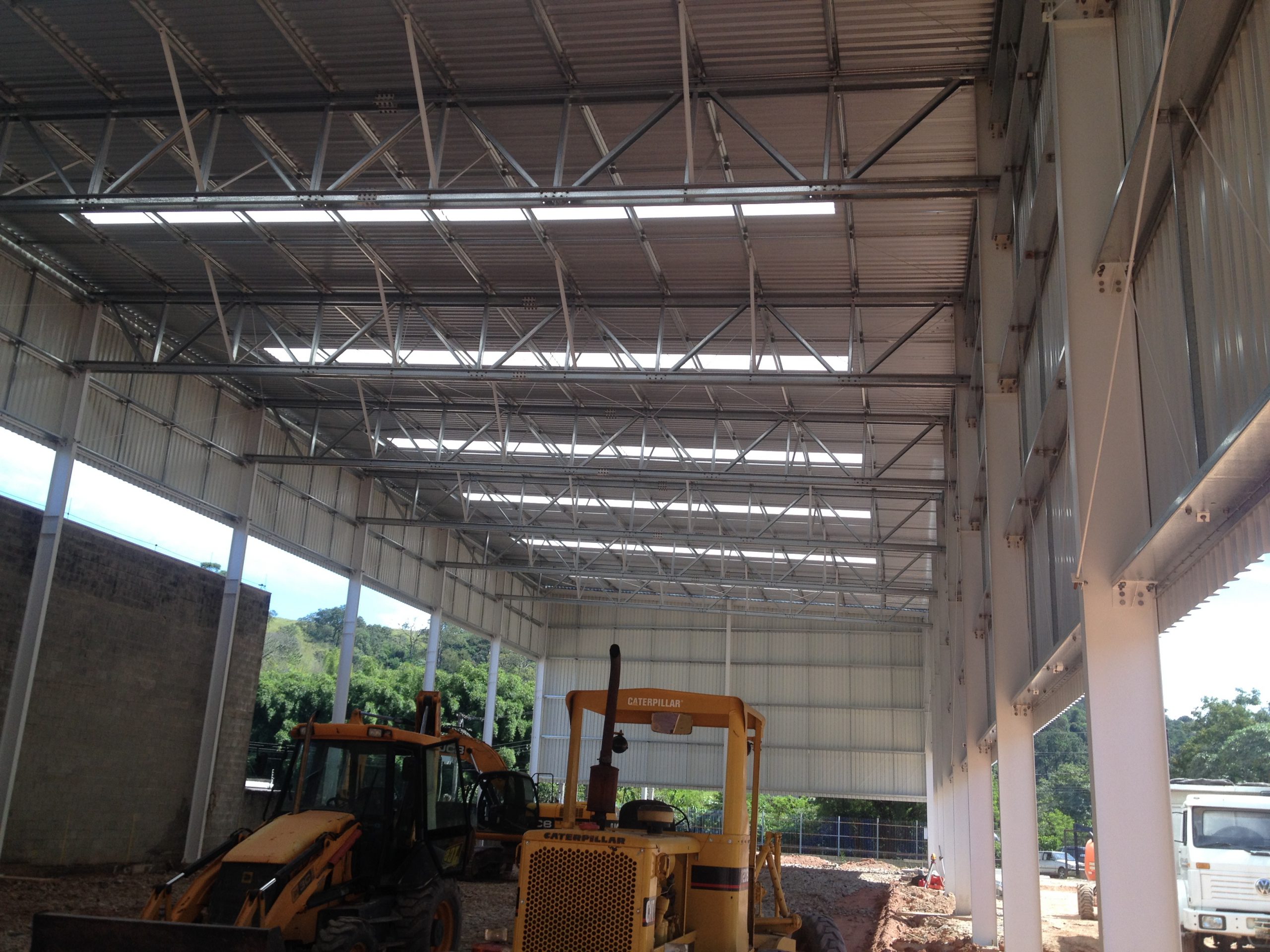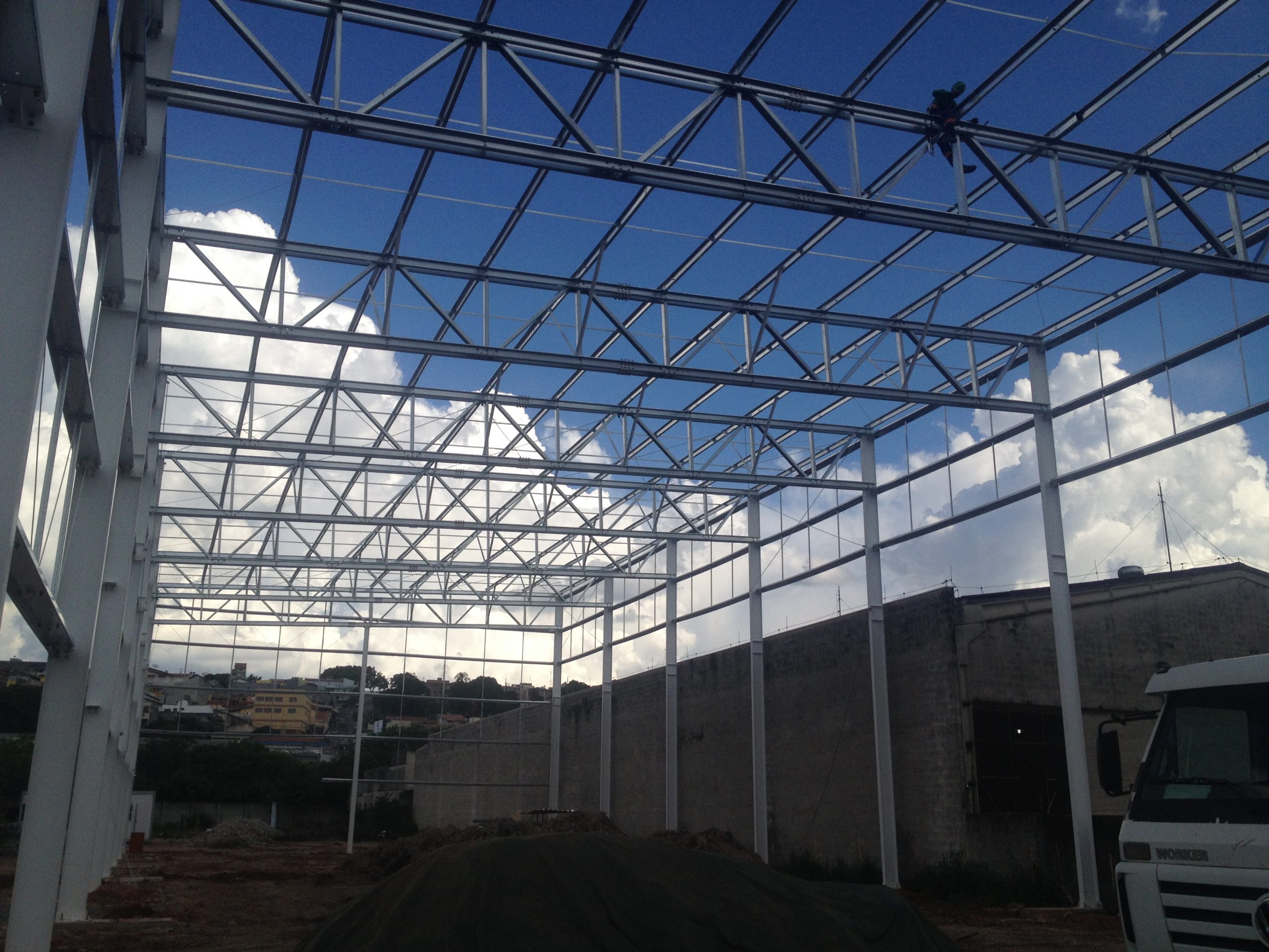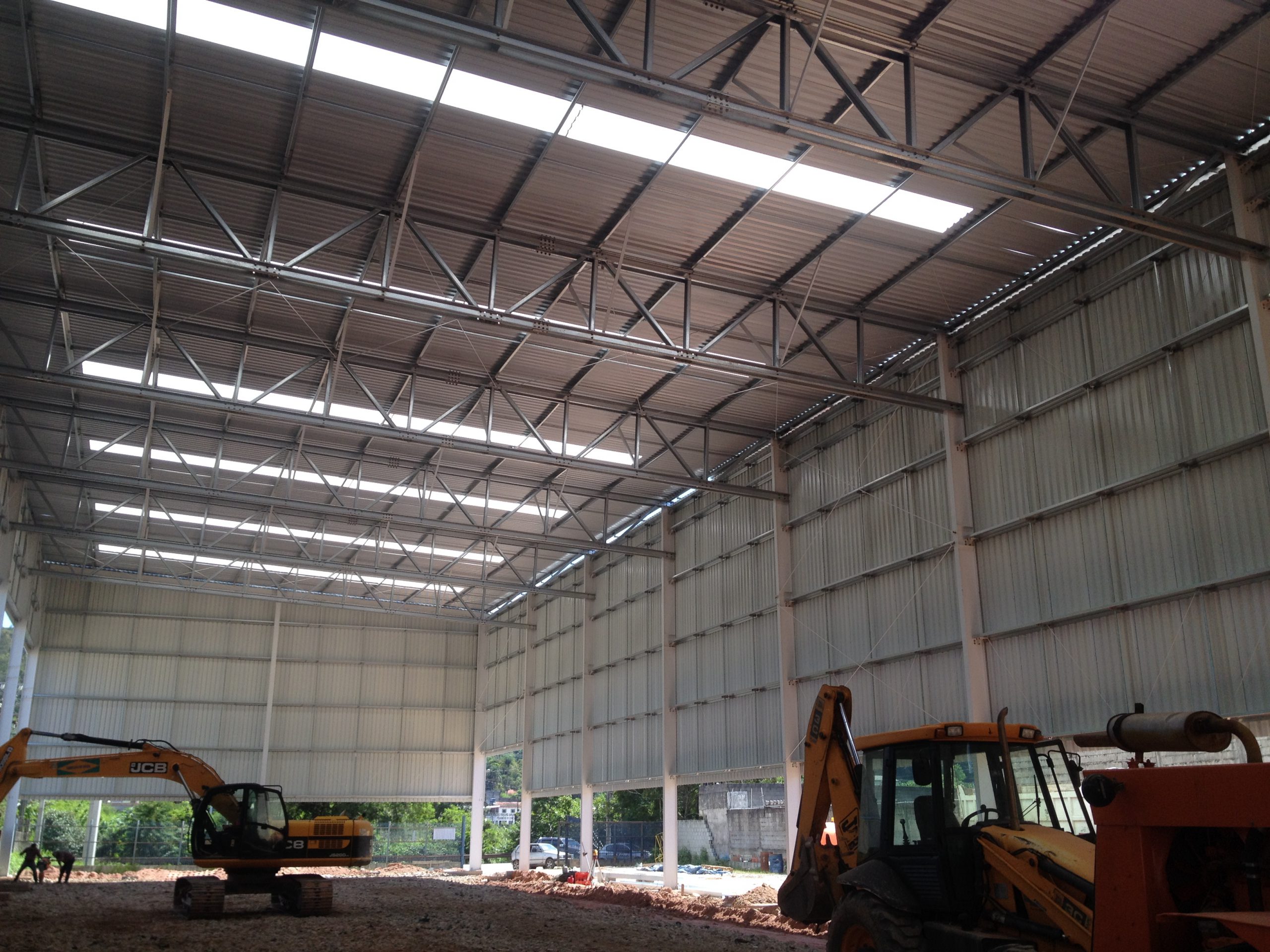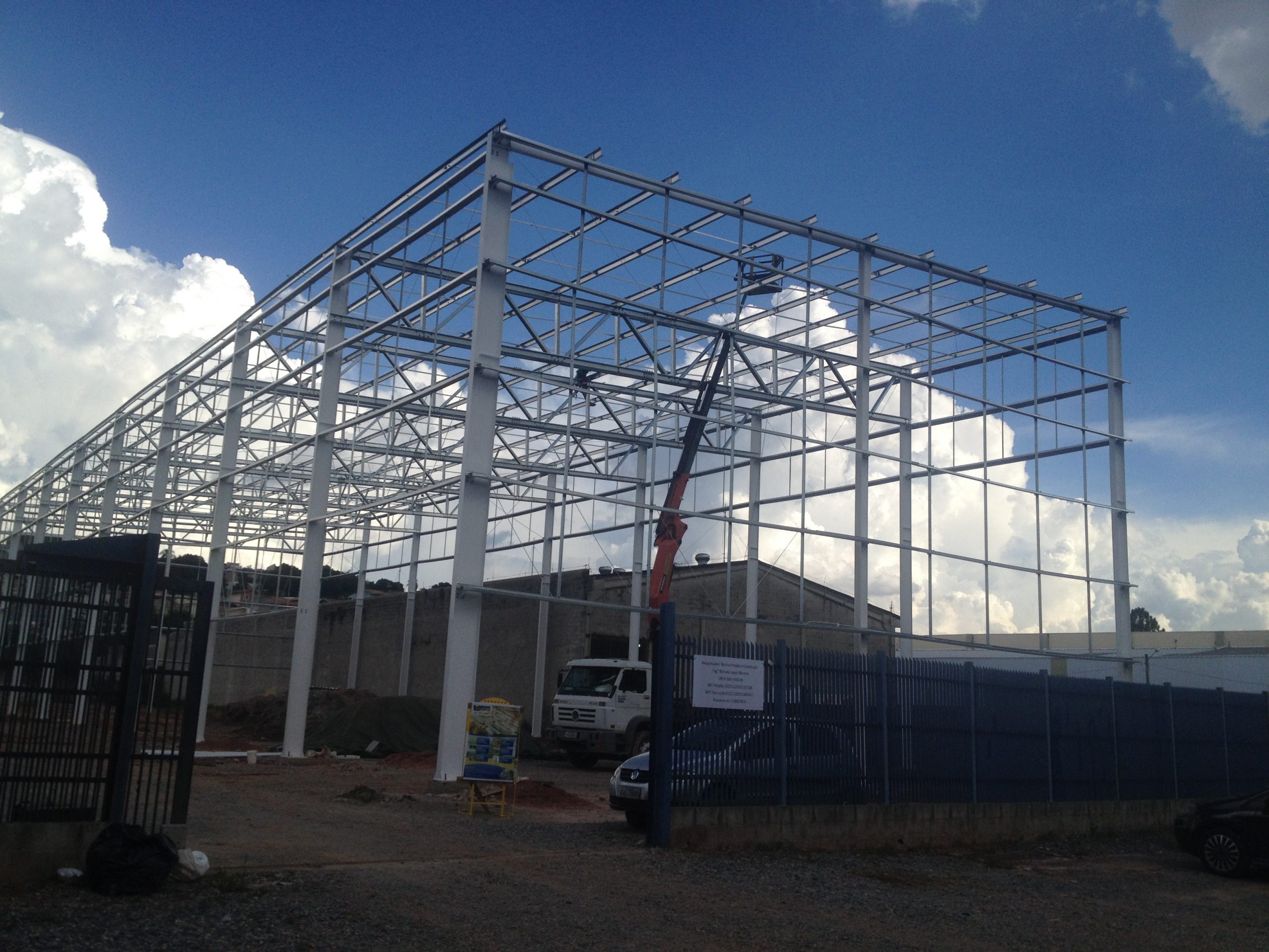 Construção de galpão industrial, com pilares metálicos e cobertura com treliças vencendo vão de 20,0m, a obra conta com caminho de rolamentos para pontes rolante com 5 ton, tem um edificio de escritorios de 2 pavimentos, com fechamentos em paineis isotermicos e lajes em steel deck.