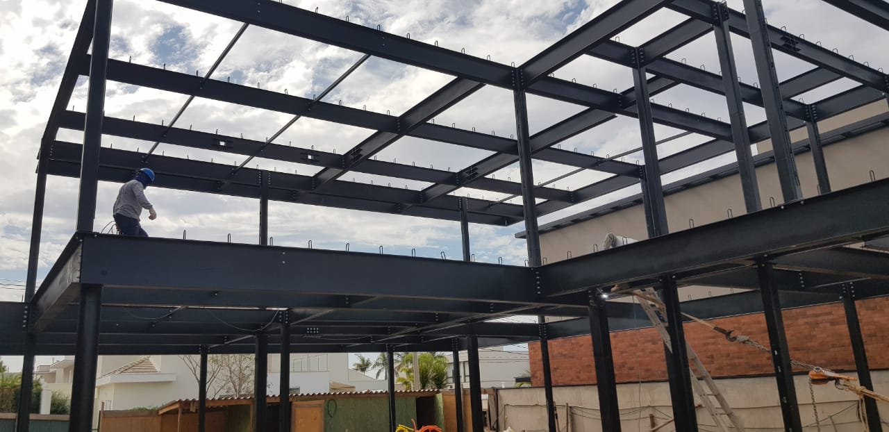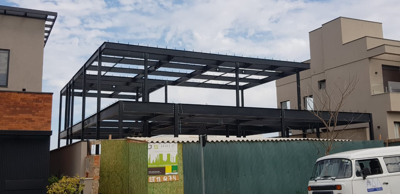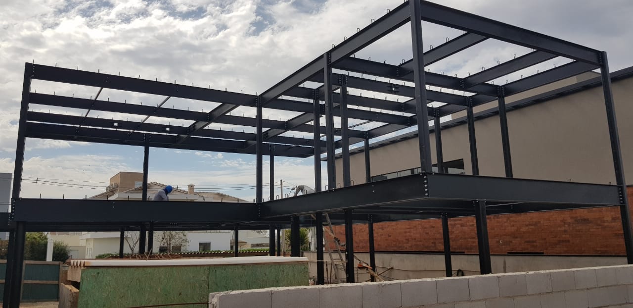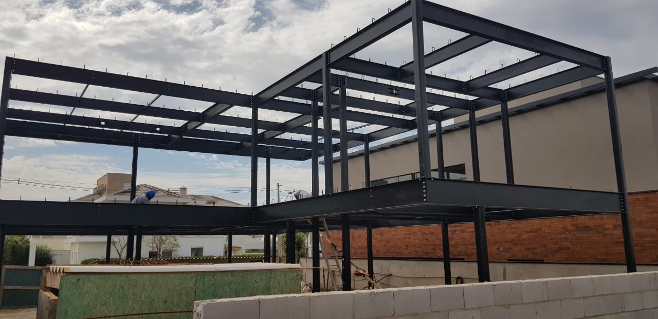 Residencia em 2 pavimentos com colunas e vigas metálicas, para receber lajes treliçadas, a estrutura tem ligações aparafusadas e soldadas no campo, e teve um tempo de montagem de apenas 15 dias