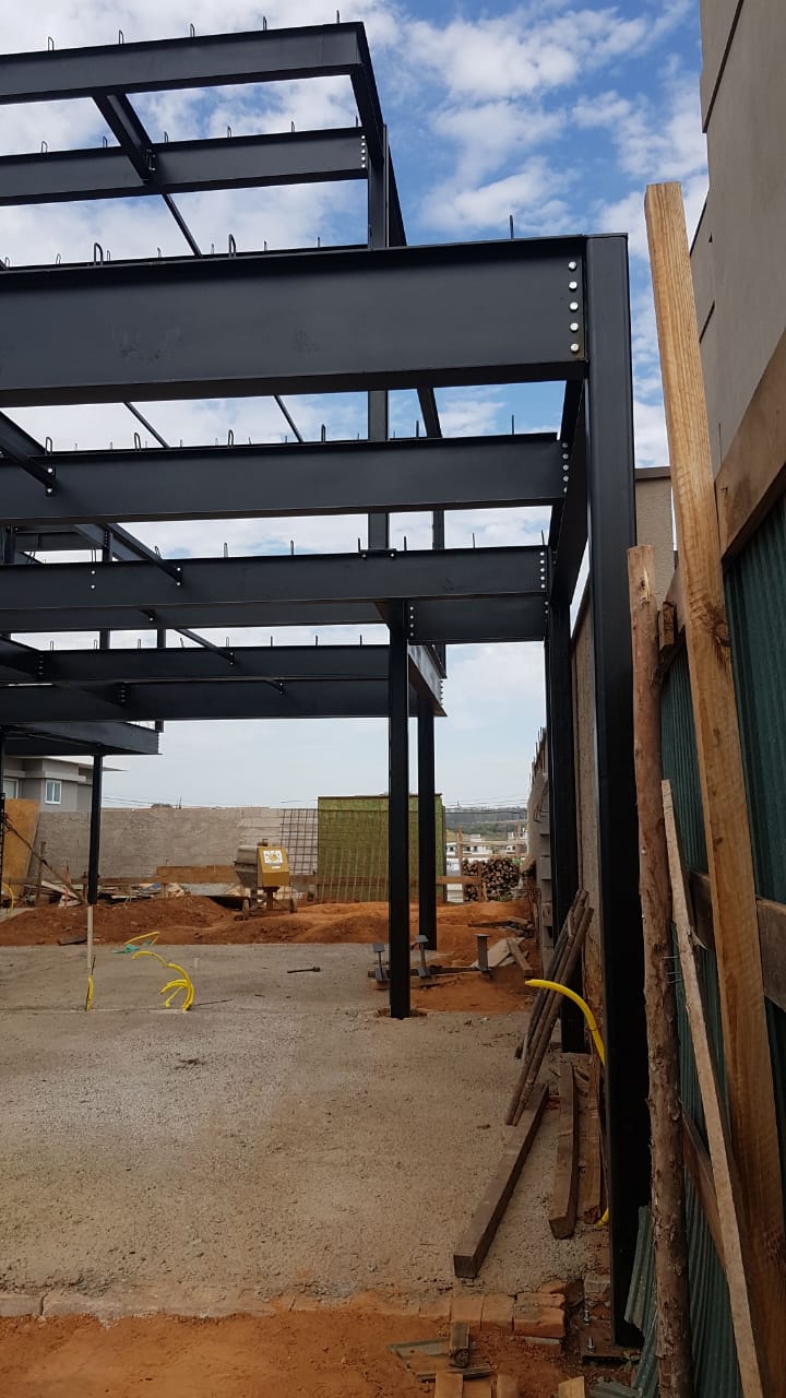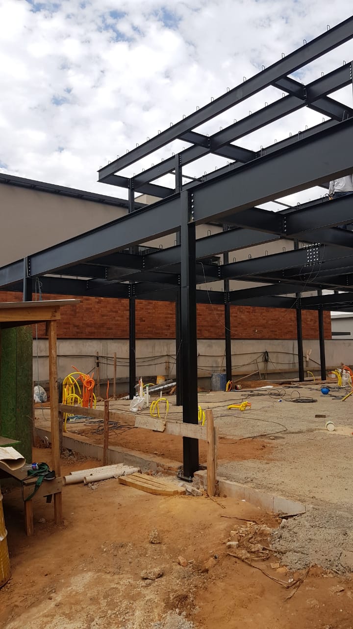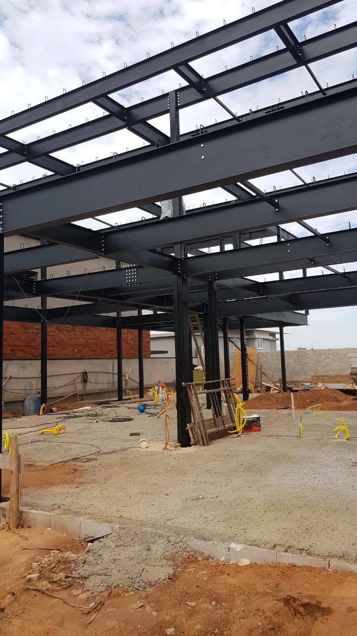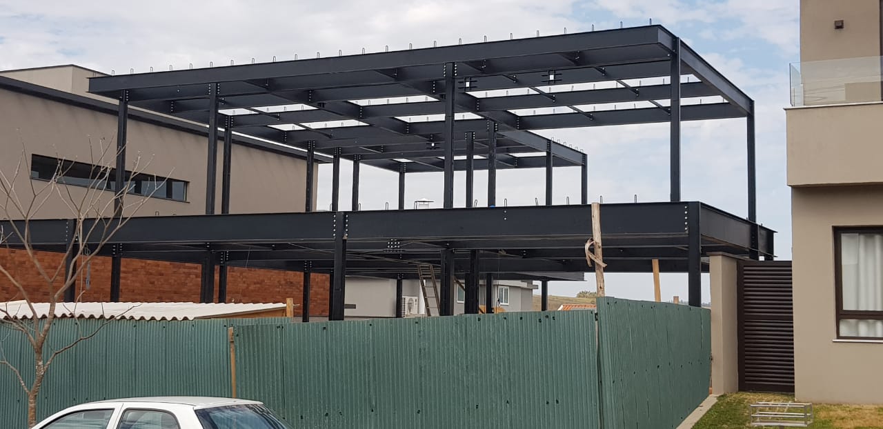 Residencia em 2 pavimentos com colunas e vigas metálicas, para receber lajes treliçadas, a estrutura tem ligações aparafusadas e soldadas no campo, e teve um tempo de montagem de apenas 15 dias